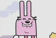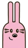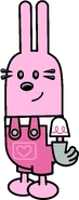 Widget is light pink and has floppy rabbit ears. She has black eyes and a white undershirt and hot-pink overalls with a heart. She is usually wearing her light gray gloves which match the color of the buttons on her overalls.